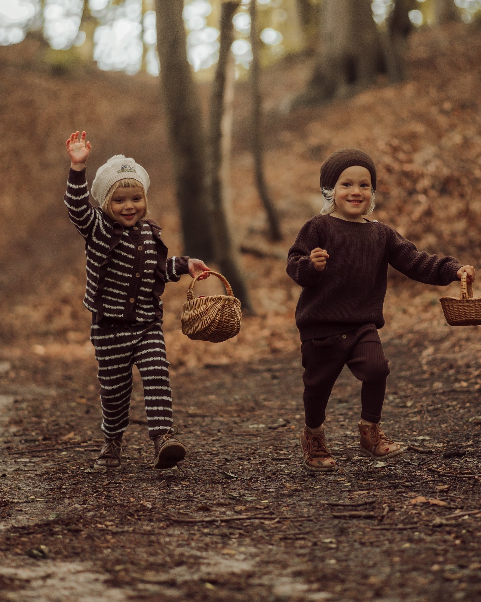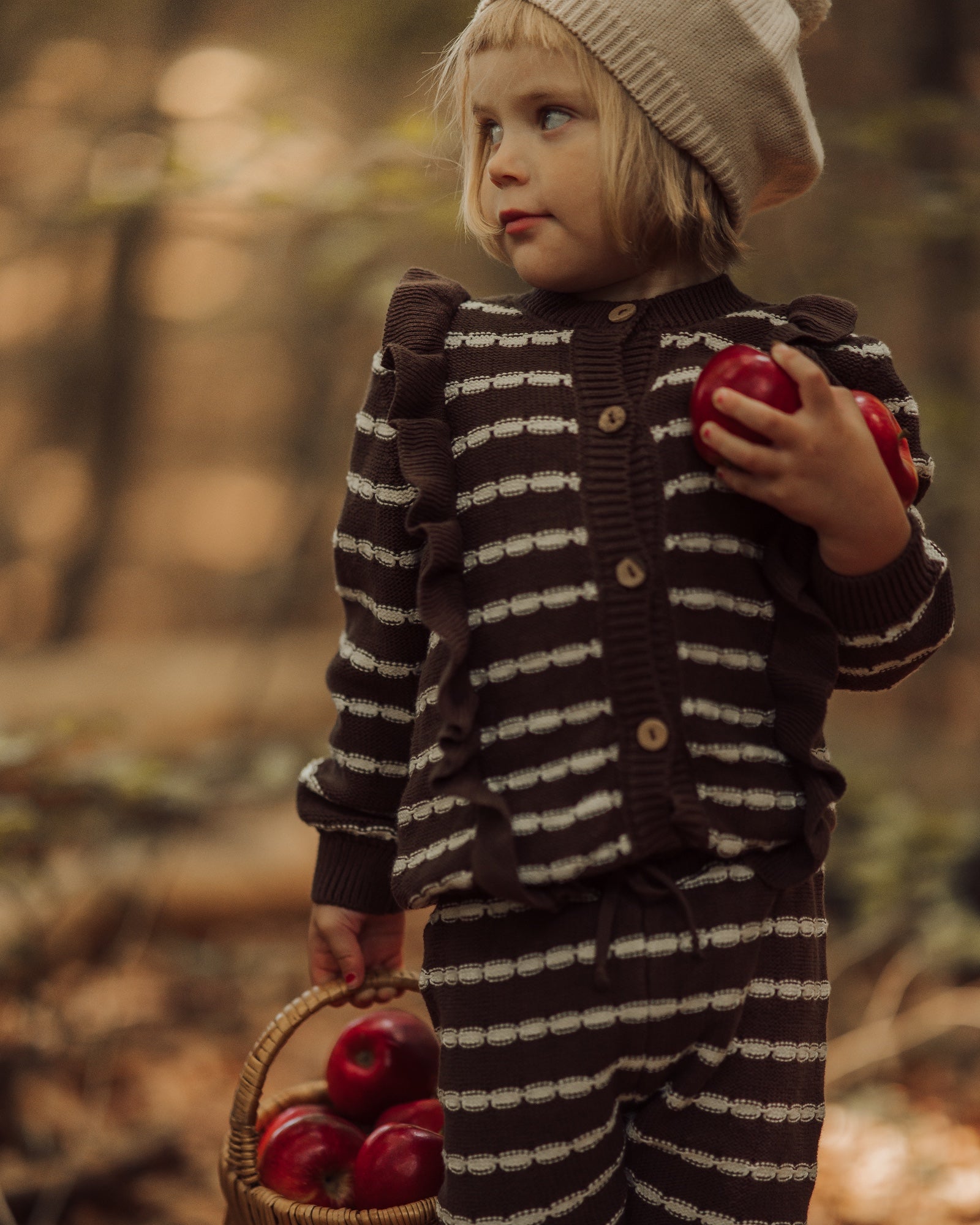 Adorable cardigan en 100 % coton biologique, avec volants délicats et rayures horizontales brun et beige. Doux et confortable, il offre une grande liberté de mouvement et une atmosphère chaleureuse. À associer avec le pantalon rayé Alba pour un ensemble harmonieux et élégant.