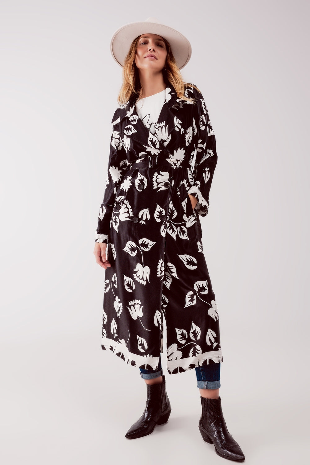 Design: Ce kimono long au motif floral blanc sur fond noir est une pièce statement parfaite pour un look bohème-chic. Fluide et élégant, il apporte du mouvement à la silhouette grâce à sa coupe ample. Il se ferme avec une ceinture assortie à nouer à la taille pour un effet plus structuré.