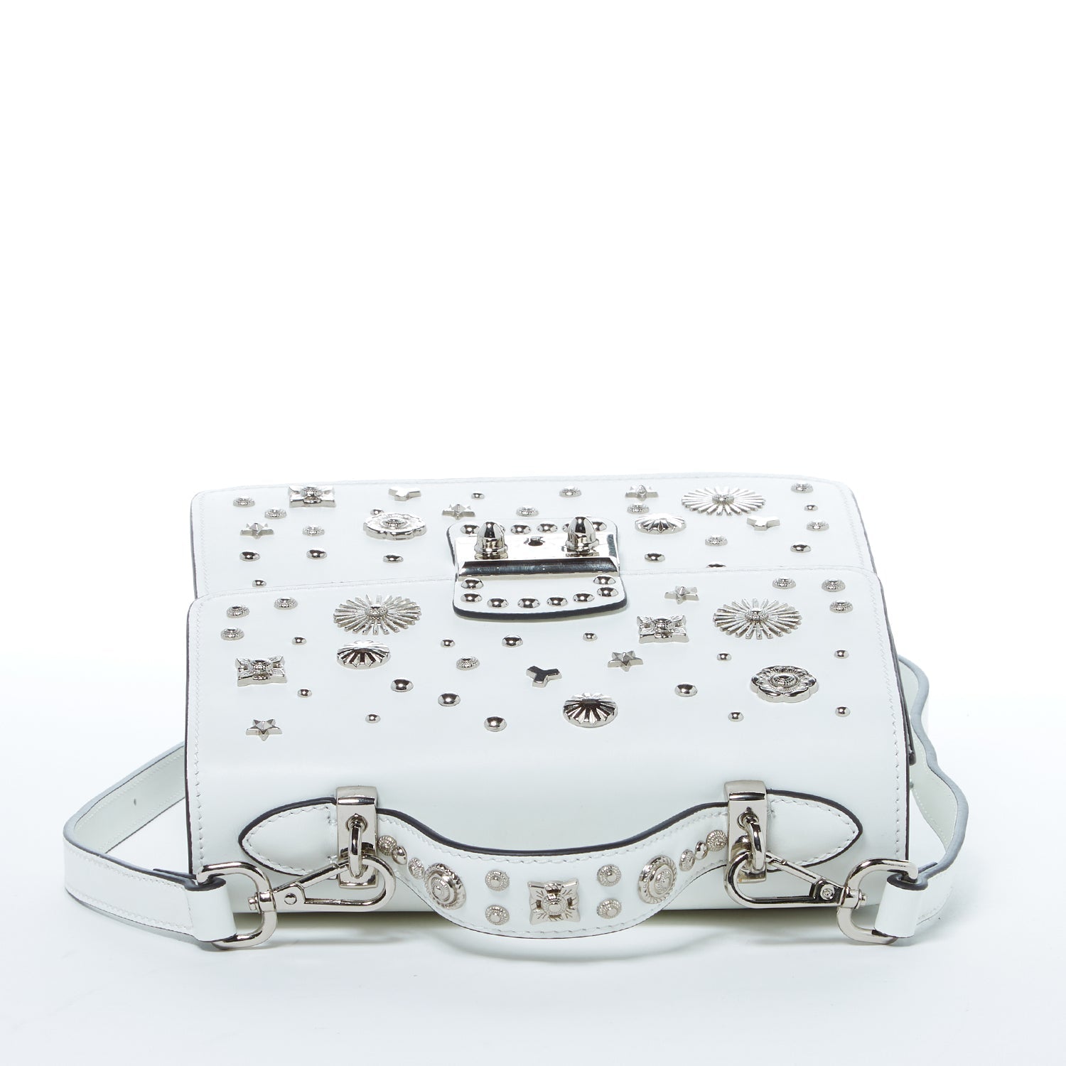 Le sac à dos Hollywood en cuir blanc SUSU allie style et fonctionnalité. Avec ses bandoulières ajustables et amovibles, il se transforme en sac à main ou bandoulière pour plus de polyvalence. Fermeture à verrou métallique argenté, intérieur spacieux et poches extérieures. Appliques argentées sur cuir blanc brillant, ce sac élégant est parfait pour un look moderne.